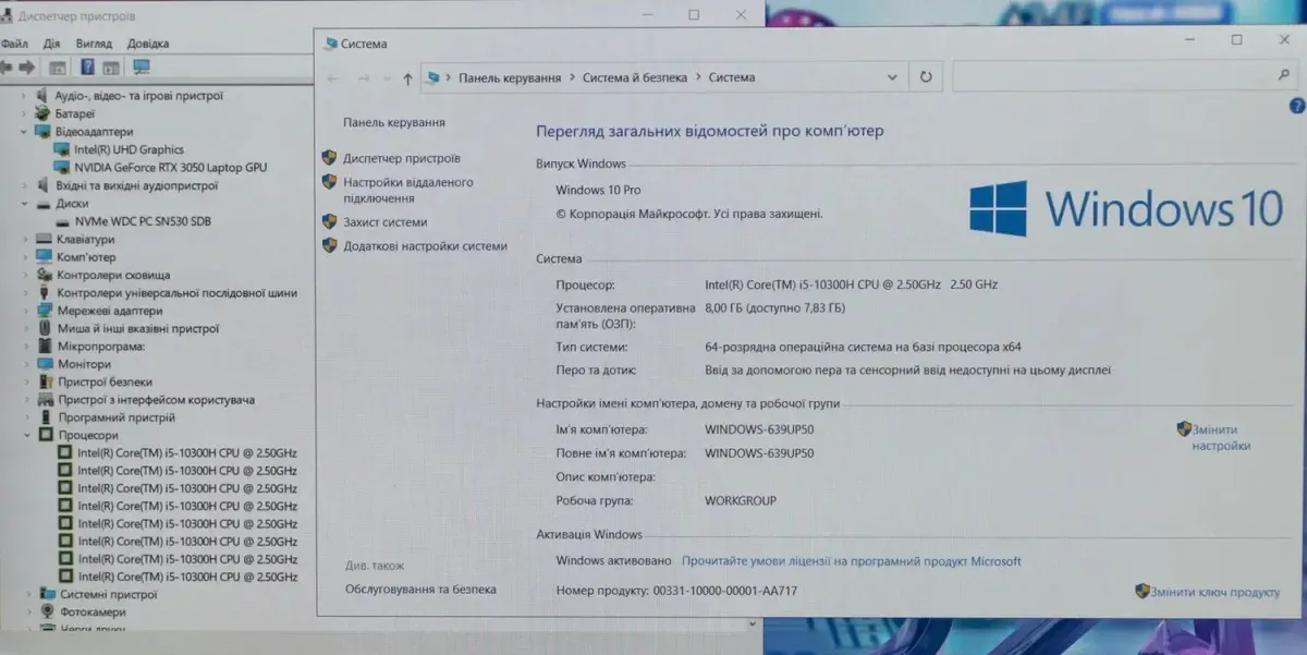 - Процесор: Intel Core i5-10300H (4 (8) ядра по 2.5 - 4.5 GHz), 8 MB Smart Cache