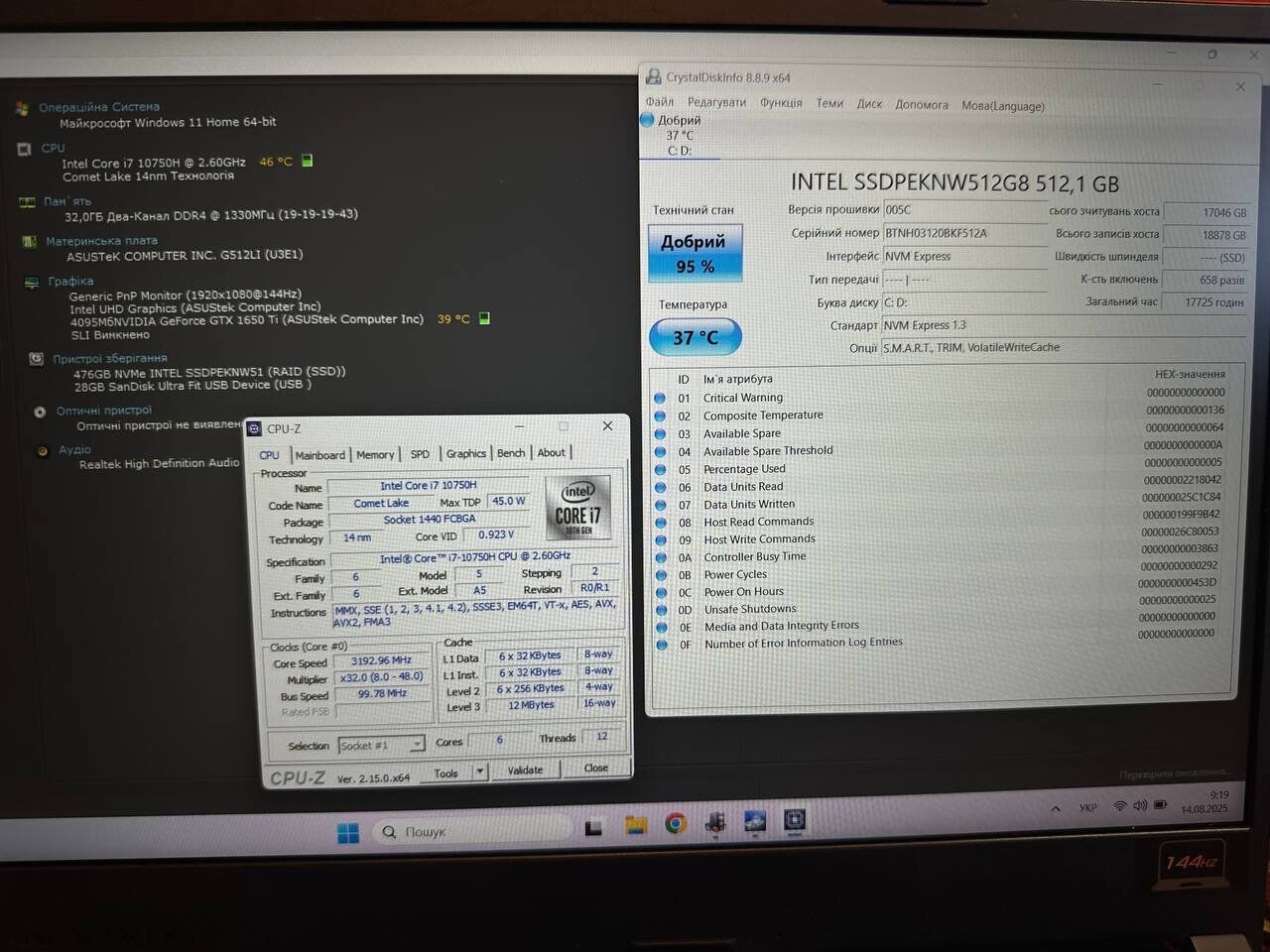 - Процесор: Intel Core i7-10750H (6 (12) ядер по 2.6 - 5.0 GHz), 12 MB Smart Cache