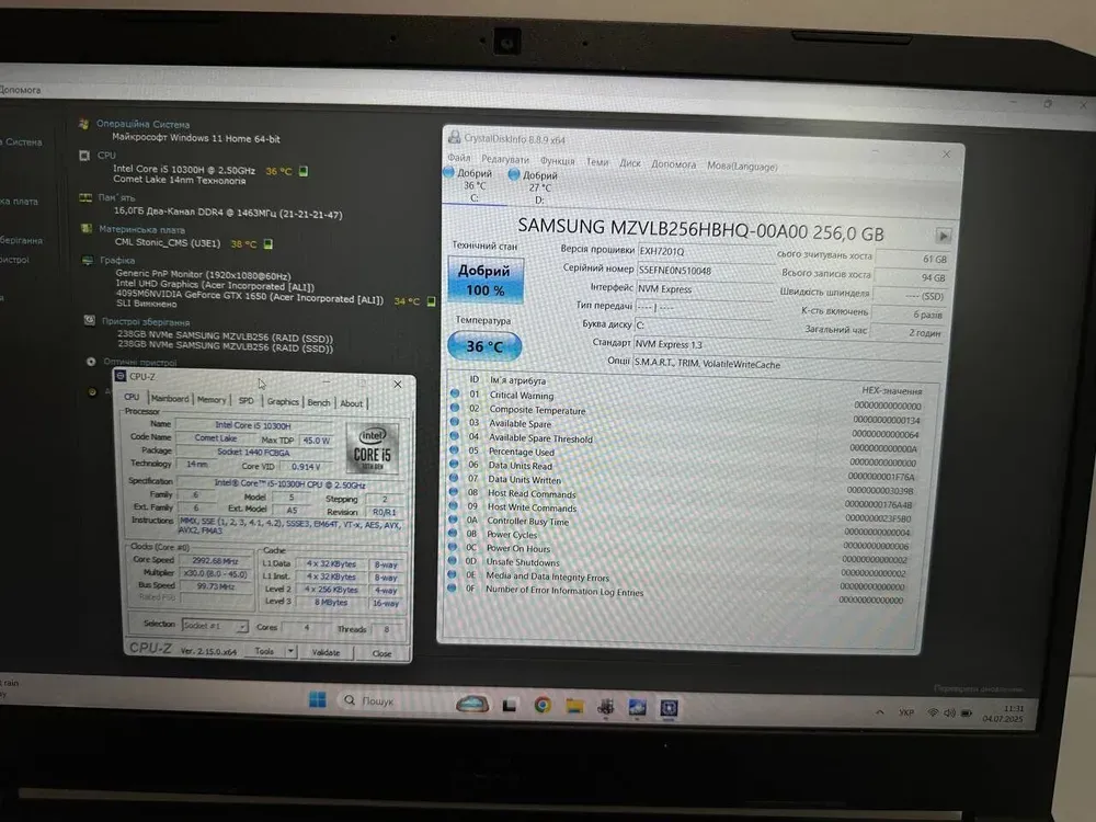 - Процесор: Intel Core i5-10300H (4 (8) ядра по 2.5 - 4.5 GHz), 8 MB Smart Cache