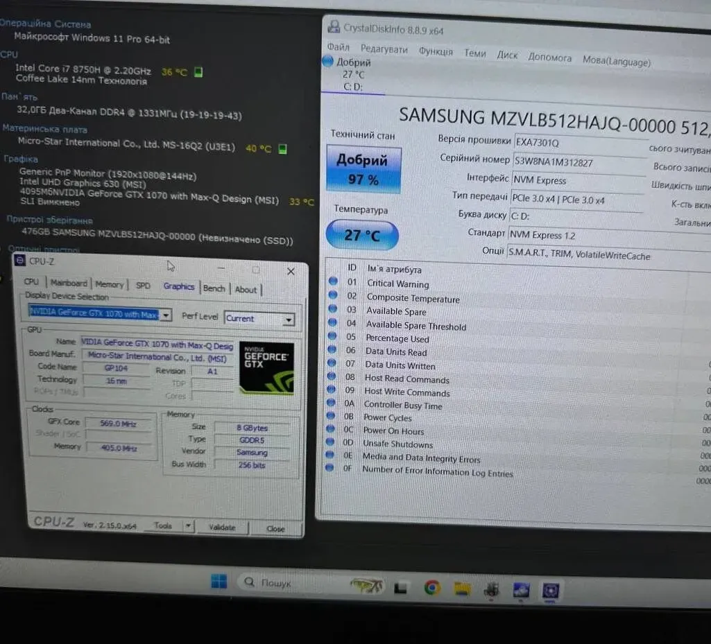 - Графіка: дискретна nVidia GeForce GTX 1070 Max-Q, 8 GB GDDR5, 256-bit