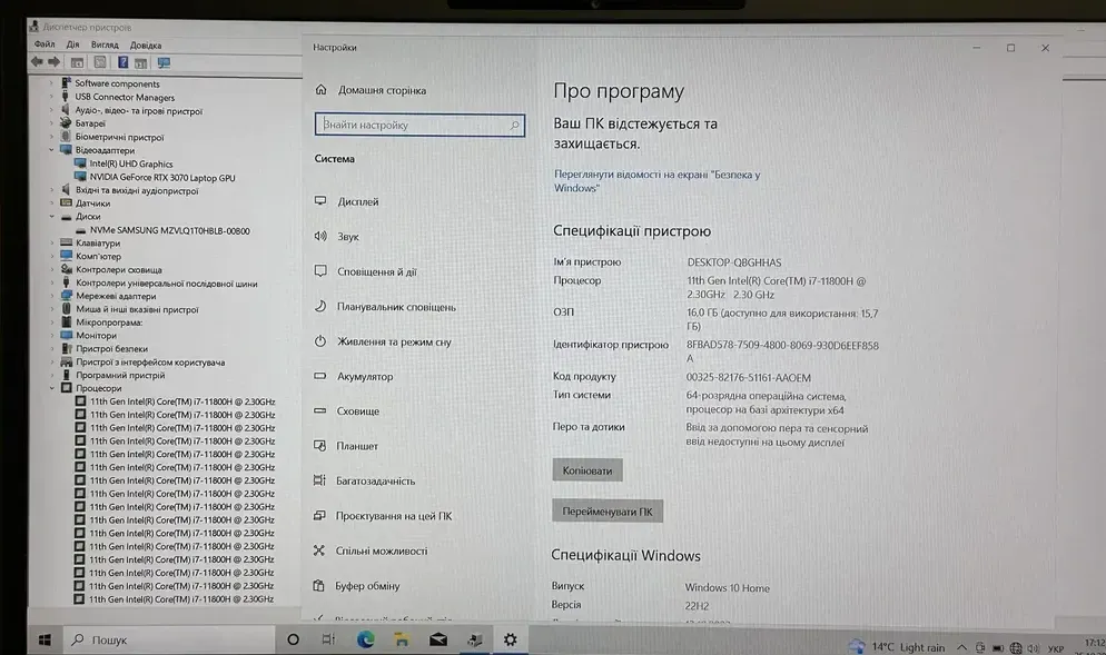 - Графіка: nVidia GeForce RTX 3070, 8 GB GDDR6, 256-bit