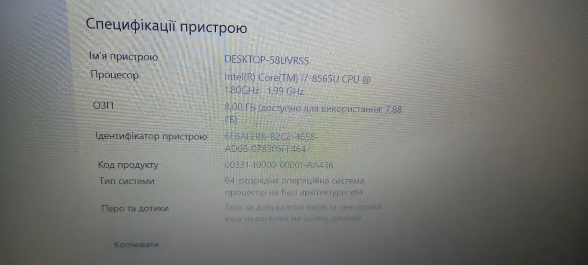 - Процесор: Intel Core i7-8565U (4 (8) ядра по 1.8 - 4.6 GHz), 8 MB Smart Cache