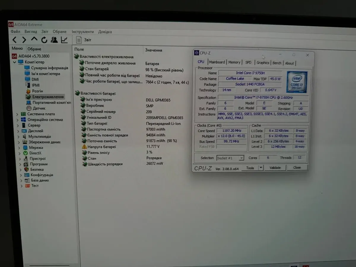 - Процесор: Intel Core i7-9750H (6 (12) ядер по 2.6 - 4.5 GHz), 12 MB Smart Cache