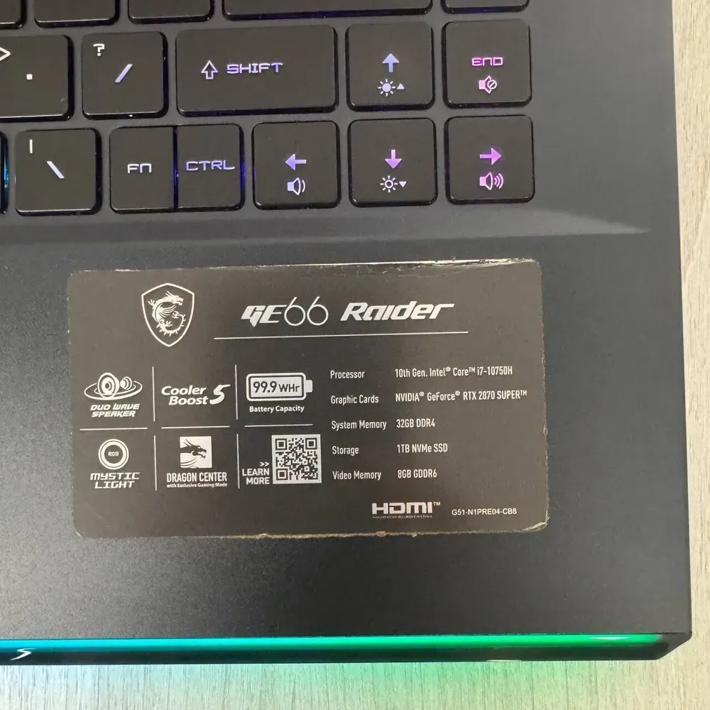 Ігровий ноутбук MSI GE66 Raider 10SFS / 15.6" (1920x1080) IPS / Intel Core i7-10750H (6 (12) ядер по 2,6 - 5,0 ГГц) / 32 ГБ DDR4 / 1000 ГБ SSD NVMe / nVidia GeForce RTX 2070 Super, 8 ГБ GDDR6, 256-bit / WebCam б/в