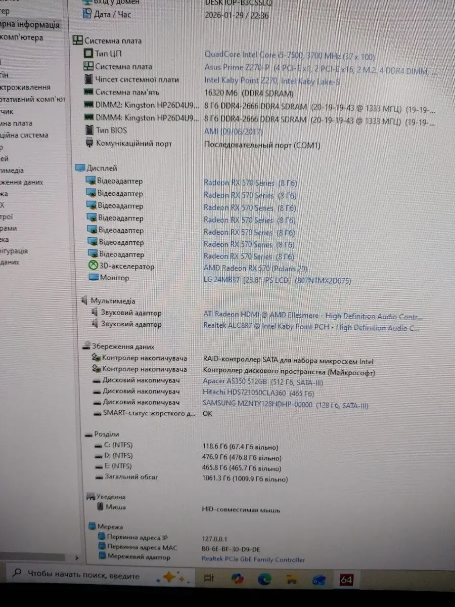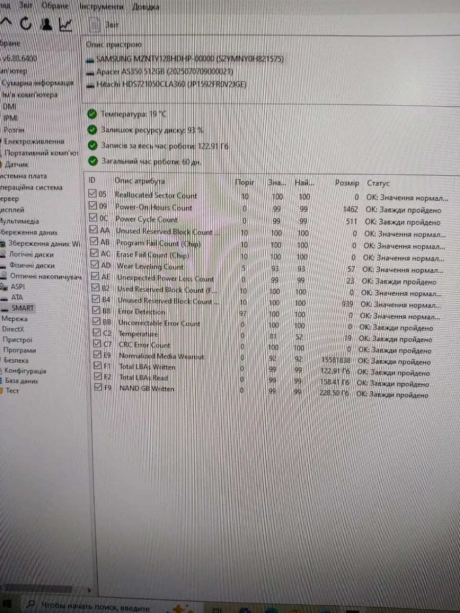 - Постійна пам'ять: 128 GB SSD M.2 NVMe Samsung + 512 GB SSD Apacer (нова комплектуюча) + 500 GB HDD (HGST / Hitachi