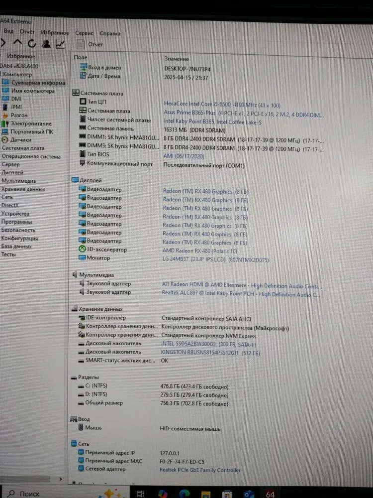 - Постійна пам'ять: 300 GB SSD Intel + 512 GB SSD M.2 NVMe Kingston