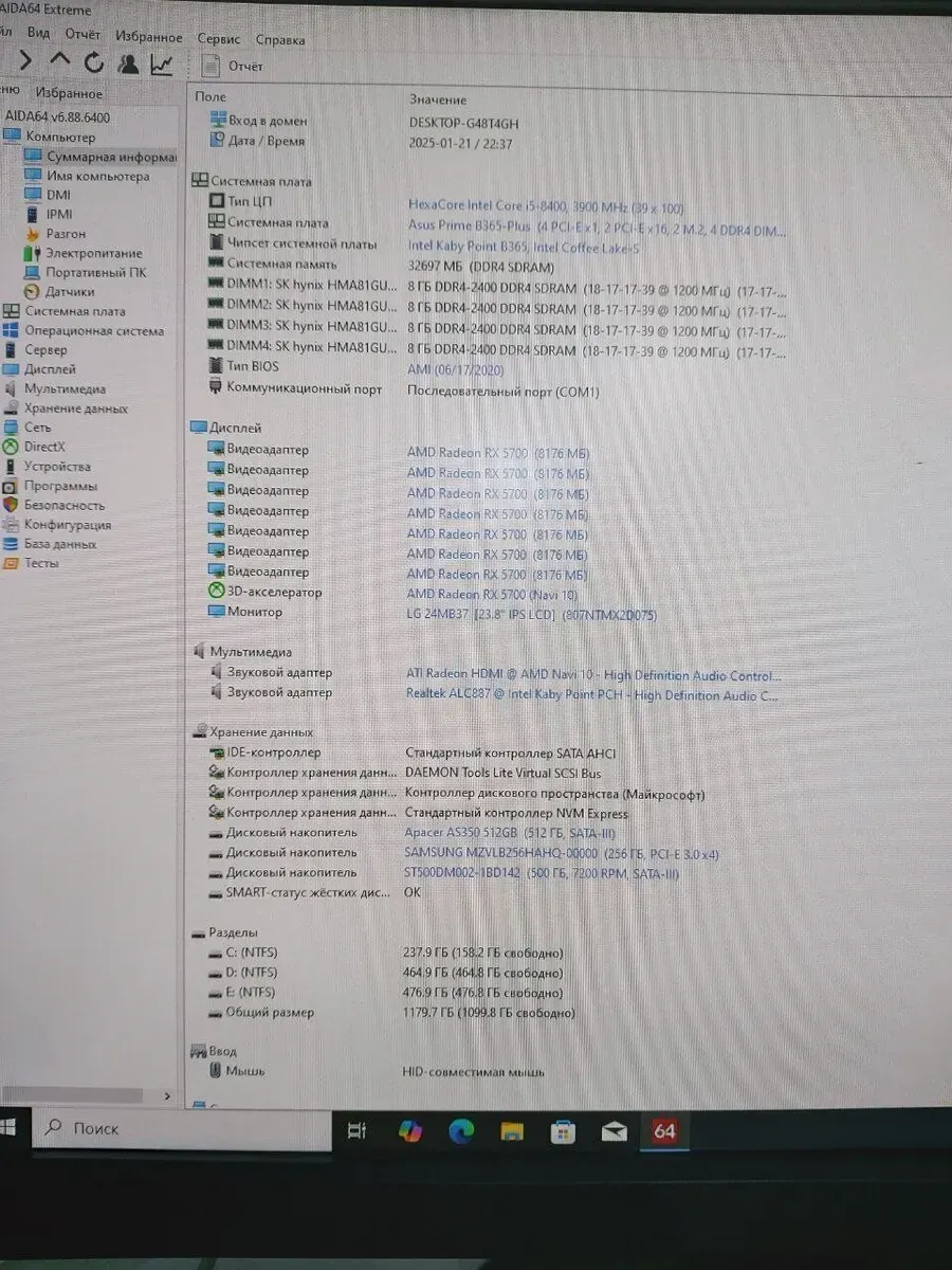 - Постійна пам'ять: 256 GB SSD M.2 NVMe Samsung + 512 GB SSD M.2 NVMe Apacer (нова комплектуюча) + 500 GB HDD Seagate 7200 об/хв