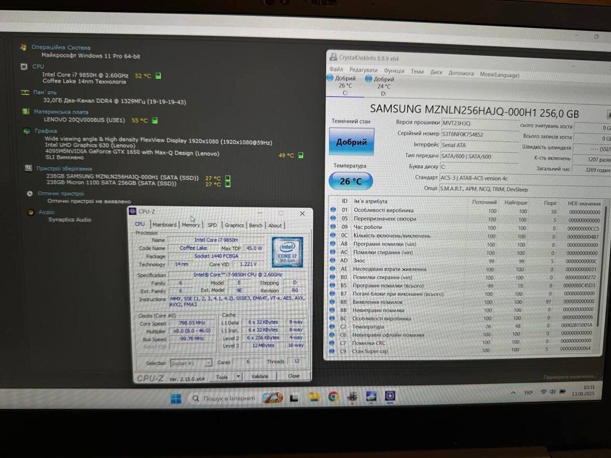 - Процесор: Intel Core i7-9850H (6 (12) ядер по 2.6 - 4.6 GHz), 12 MB Smart Cache