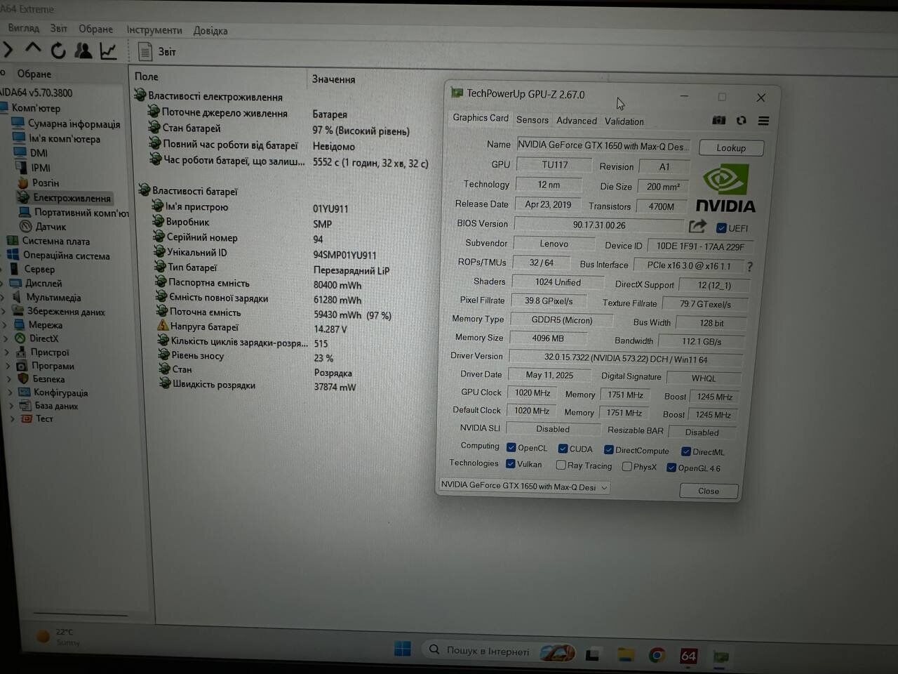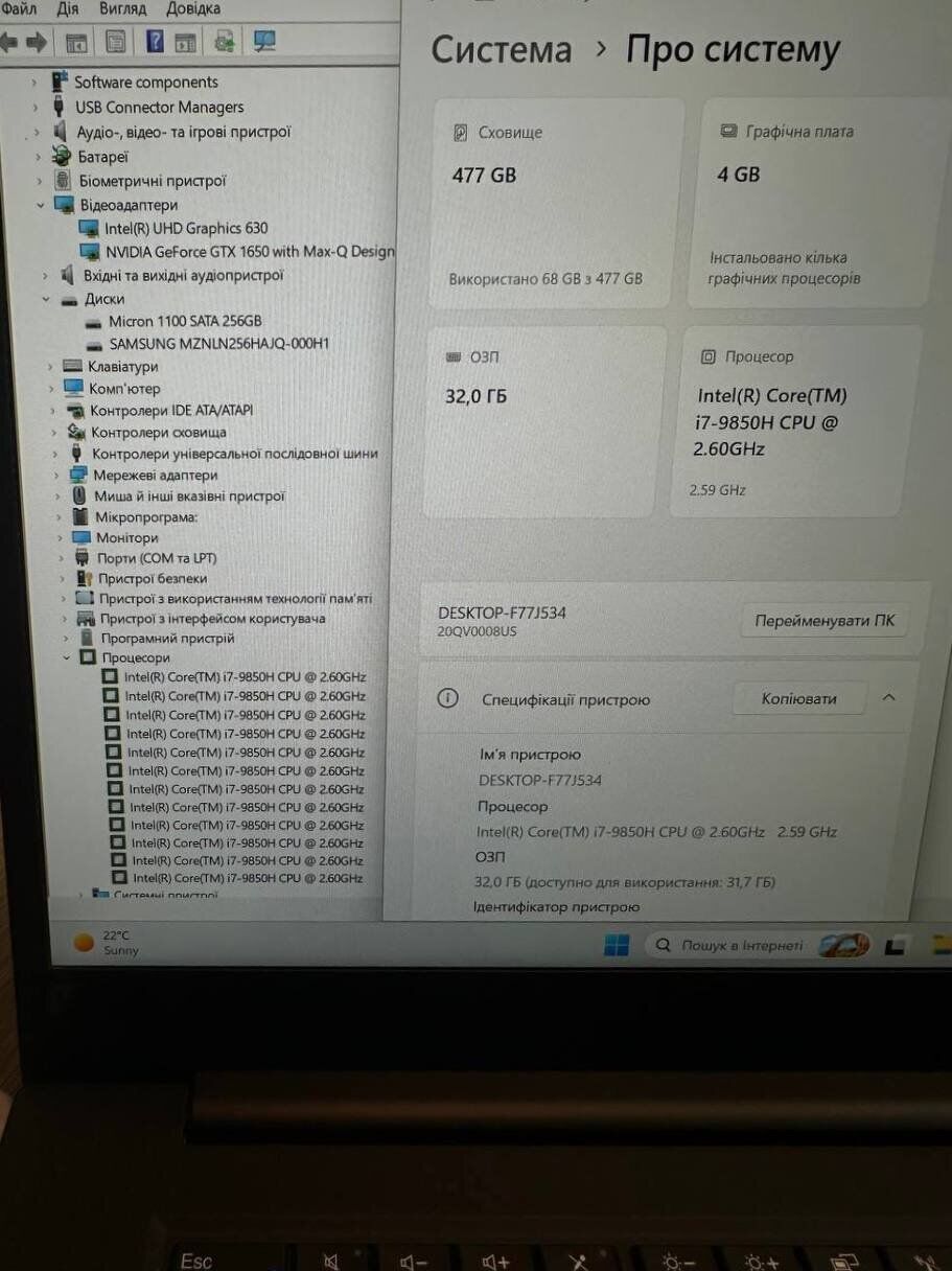 - Графіка: дискретна nVidia GeForce GTX 1650 Max-Q, 4 GB GDDR6, 128-bit