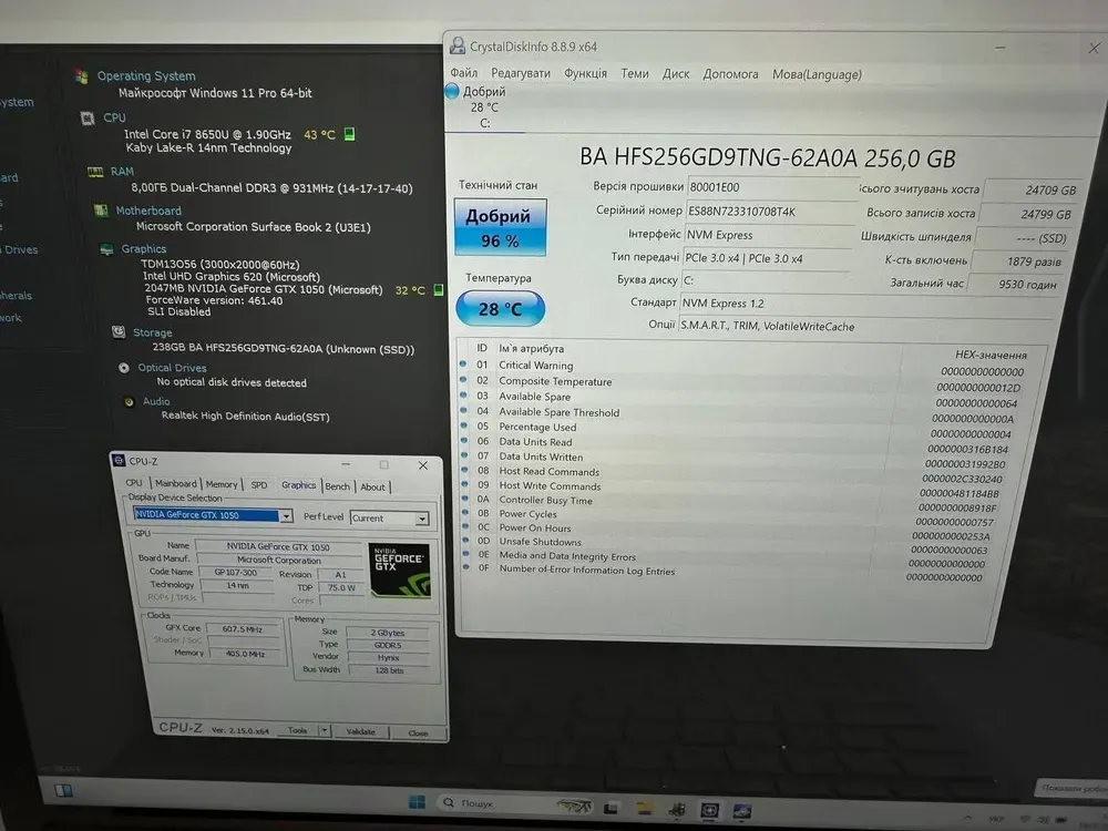 Ігровий ультрабук-трансформер Б-клас Microsoft Surface Book 2 / 13.5" (3000x2000) IPS Touch / Intel Core i7-8650U (4 (8) ядра по 1.9 - 4.2 GHz) / 8 GB DDR4 / 256 GB SSD / nVidia GeForce GTX 1050, 2 GB GDDR5, 128-bit / WebCam / Win 11 Pro б/в