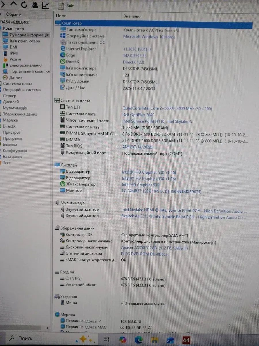 Комплект: Dell OptiPlex 3040 Tower / Intel Core i5-6600K (4 ядра по 3,5 - 3,9 ГГц) / 16 ГБ DDR3 / 512 ГБ SSD / nVidia P106-100, 6 ГБ GDDR5, 192-біт / DVD-ROM + Монітор LG 24MB37PM-B / 24" (1920x1080) IPS б/в