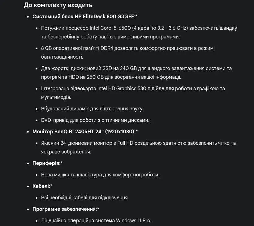 Комплект ПК: комп'ютер HP EliteDesk 800 G3 SFF на базі процесора Intel Core i5-6500 та оперативною пам'яттю 8 GB DDR4 і широкоформатний монітор Acer BL2405HT з матрицею 24" (1920x1080) TN для офісної роботи та домашніх завдань