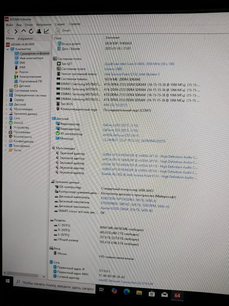 Комплект: Lenovo M800 Tower / Intel Core i5-6600 (4 ядра по 3.3 - 3.9 GHz) / 16 GB DDR4 / 256 GB SSD + 1000 GB SSD + 500 GB HDD / nVidia GeForce GTX 550 Ti, 1 GB GDDR5, 192-bit + Монітор LG 24MB37PM-B / 24" (1920x1080) IPS б/в