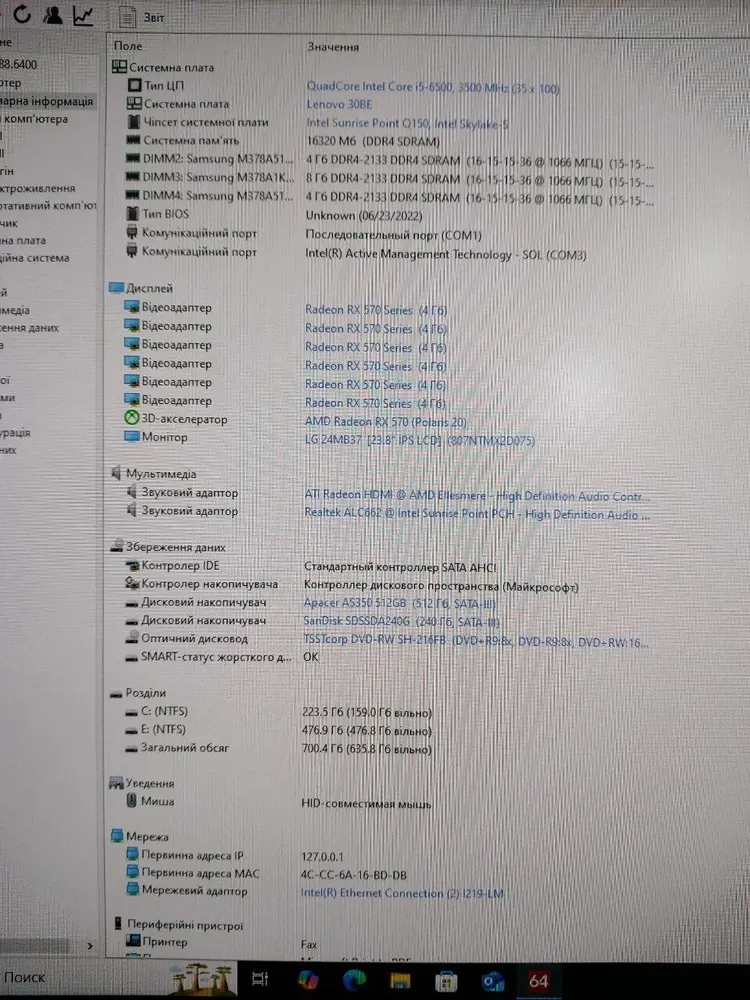 Комплект ПК: комп'ютер Lenovo ThinkCentre M800 Tower на базі процесора Intel Core i5-6500 та дискретною відеокартою AMD Radeon RX 570 4 GB і монітором LG 24MB37PM-B з матрицею 24" (1920x1080) IPS для офісної роботи та домашніх завдань