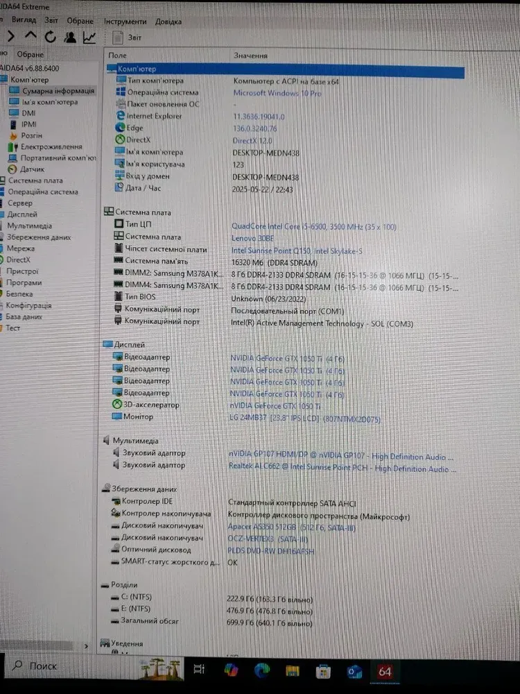 Комплект: Lenovo ThinkCentre M800 Tower / Intel Core i5-6500 (4 ядра по 3.2 - 3.6 GHz) / 16 GB DDR4 / 240 GB SSD + 512 GB SSD / nVidia GeForce GTX 1050 Ti, 4 GB GDDR5, 128-bit / DVD-ROM + Монітор LG 24MB37PM-B / 24" (1920x1080) IPS + Кабелі DVI та жив б/в