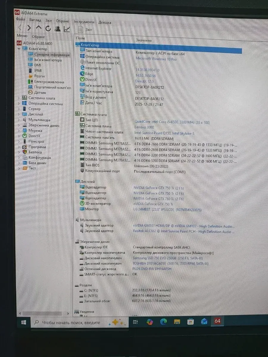 Комплект: Lenovo ThinkCentre M800 Tower / Intel Core i5-6500 (4 ядра по 3,2 - 3,6 ГГц) / 16 ГБ DDR4 / 250 ГБ SSD + 500 ГБ HDD / nVidia GeForce GTX 750 Ti, 2 ГБ GDDR5, 128-bit / DVD-ROM + Монітор LG 24MB37PM-B / 24" (1920x1080) IPS б/в