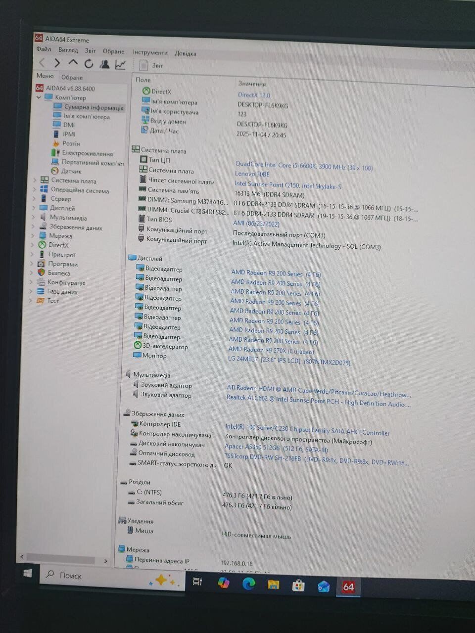 Комплект: Lenovo ThinkCentre M800 Tower / Intel Core i5-6600K (4 ядра по 3,5 - 3,9 ГГц) / 16 ГБ DDR4 / 512 ГБ SSD / AMD Radeon R9 270X, 4 ГБ GDDR5, 256-біт / DVD-ROM + Монітор LG 24MB37PM-B / 24" (1920x1080) IPS б/в