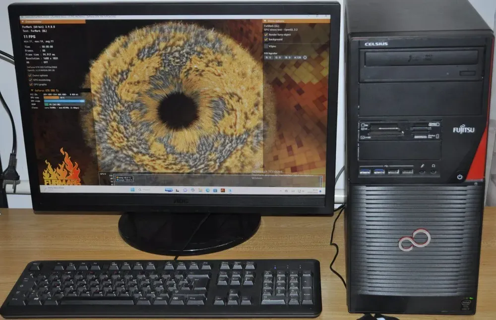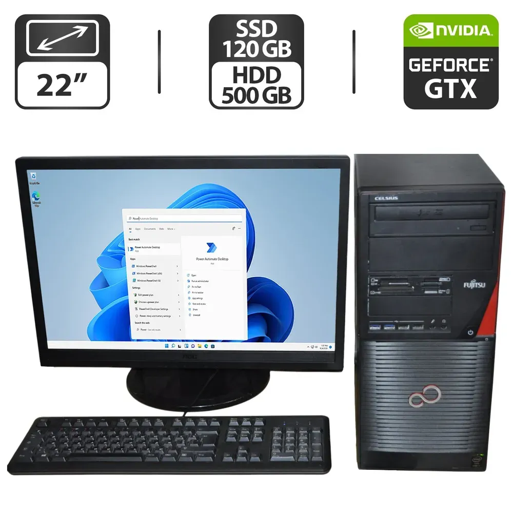 Комплект ПК: Fujitsu Celsius W530 Tower / Intel Core i5-4590 (4 ядра по 3.3 - 3.7 GHz) / 16 GB DDR3 / 120 GB SSD + 500 GB HDD / nVidia GeForce GTX 550 Ti, 4 GB GDDR5, 128-bit + Монітор Б-клас AOC / 22" (1680x1050) TN + Нові клавіатура, мишка, кабелі б/в