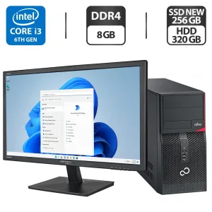 Комплект ПК: Fujitsu P556 E85+ Tower / Intel Core i3-6100 (2 (4) ядра по 3.7 GHz) / 8 GB DDR4 / 256 GB SSD NEW + 320 GB HDD / Intel HD Graphics 530 + Монітор Б-клас 22" (1680x1050) TN/DVI/Divisional brands + Клавіатура, мишка, кабелі, Windows 11 Pro б/в