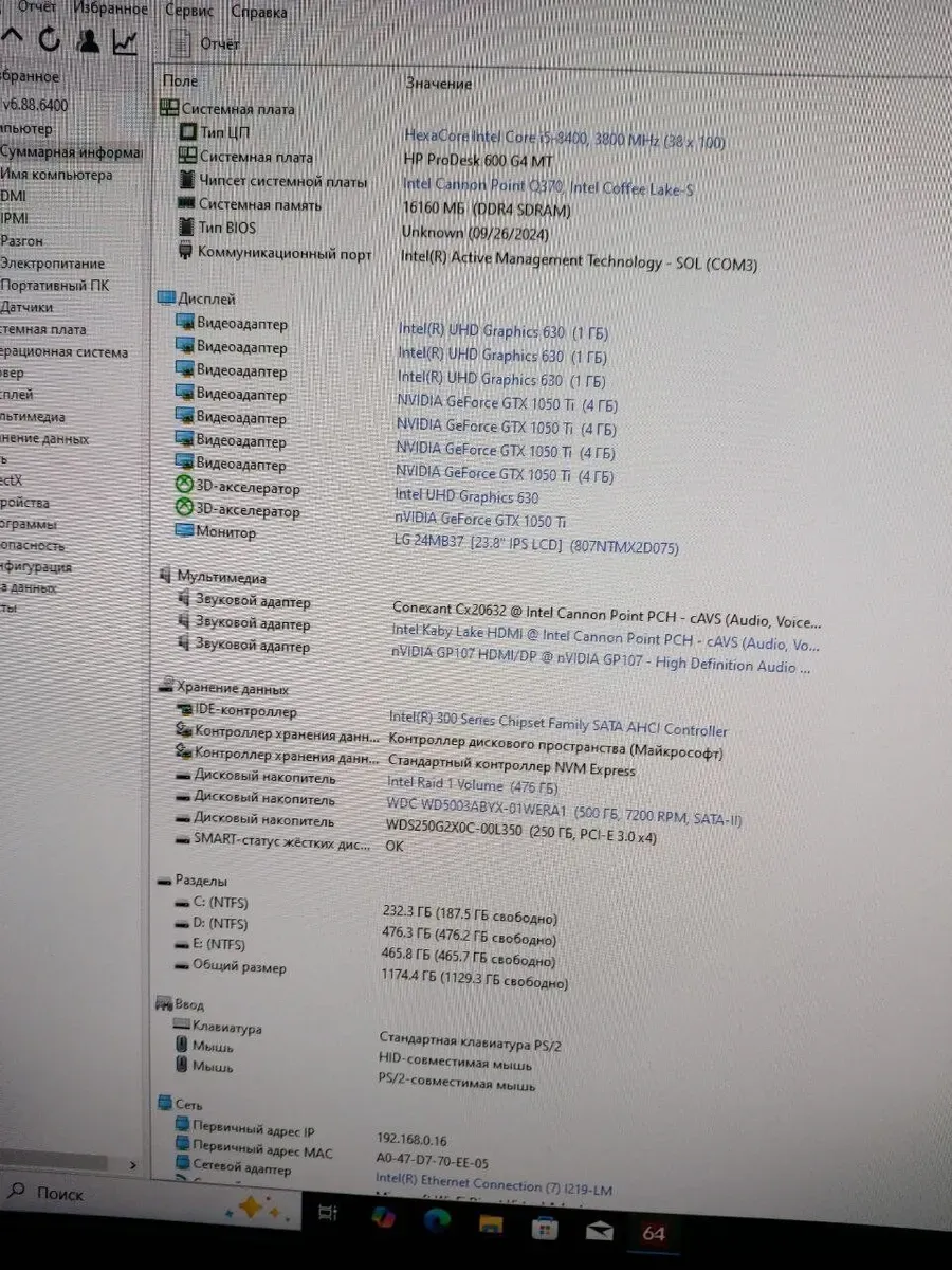 Комплект ПК: HP 600 G4 Tower / Intel Core i5-8400 (6 ядер по 2.8 - 4.0 GHz) / 16 GB DDR4 / 250 GB SSD M.2 + 512 GB SSD + 500 GB HDD / nVidia GeForce GTX 1050 Ti, 4 GB GDDR5, 128-bit + Монітор LG 24MB37PM-B / 24" (1920x1080) б/в