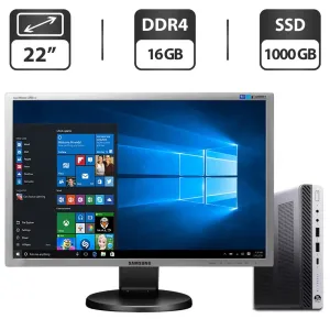 Комплект ПК: HP EliteDesk 800 G3 Desktop Mini USFF / Intel Core i5-6500T (4 ядра по 2.5 - 3.1 GHz) / 16 GB DDR4 / 1000 GB SSD / Intel UHD Graphics 630 + Монітор Б-клас 22" (1680x1050) TN б/в
