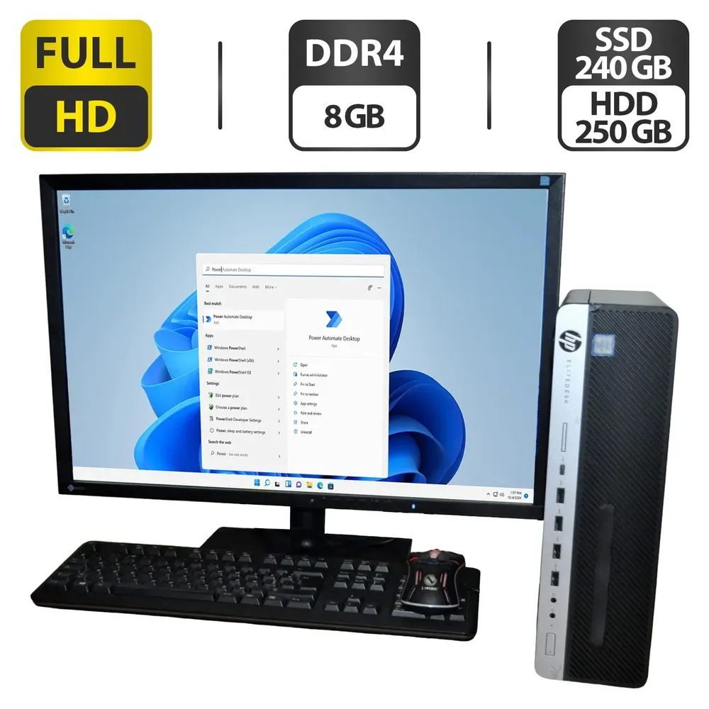 Комплект ПК: HP EliteDesk 800 G3 SFF / Intel Core i5-6500 (4 ядра по 3.2 - 3.6 GHz) / 8 GB DDR4 / 240 GB SSD + 250 GB HDD / Intel HD Graphics 530 + Монітор Б-клас EIZO FlexScan EV2436W / 24" (1920x1080) IPS + Клавіатура, мишка, кабелі / Windows 11 Pro б/в