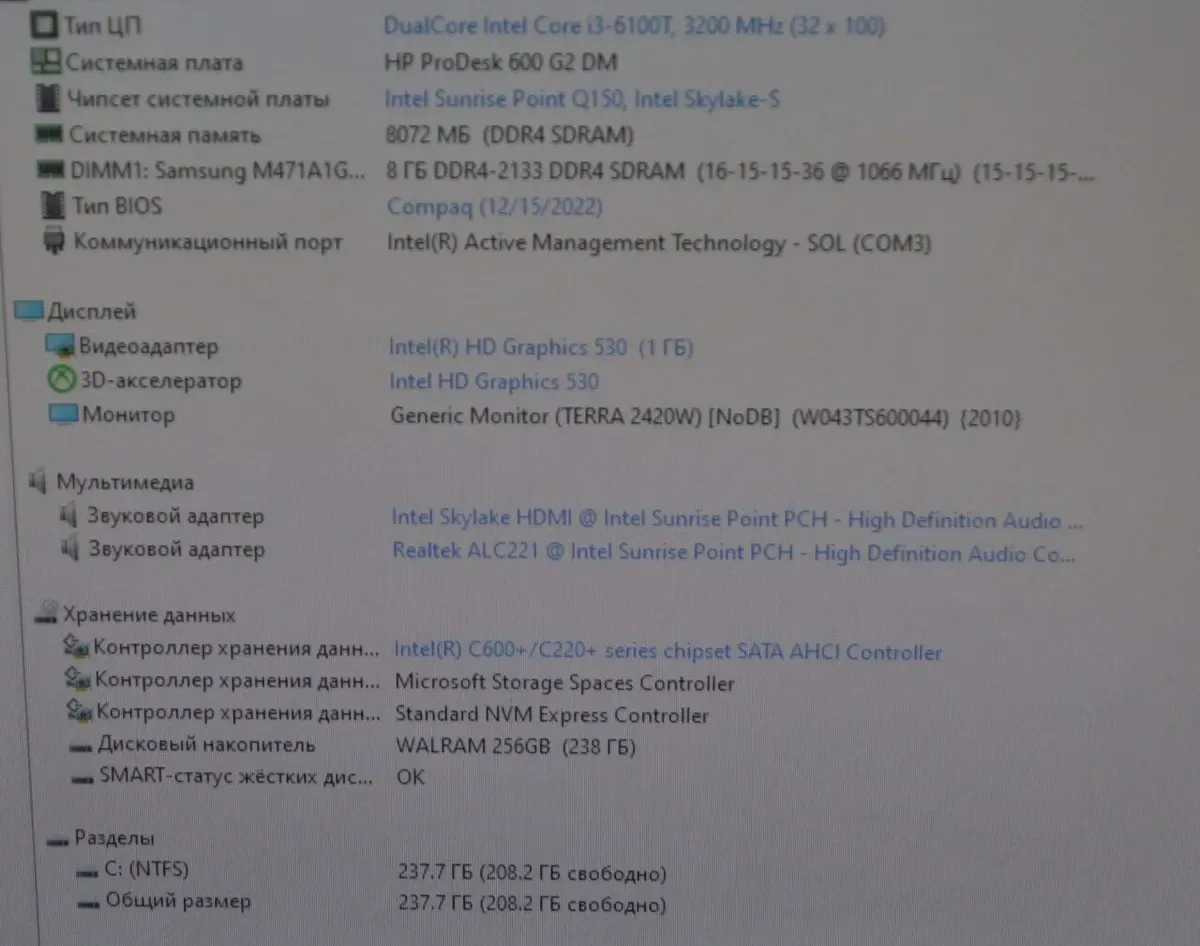 Комплект ПК: HP ProDesk 600 G2 Mini PC USFF / Intel Core i3-6100T (2 (4) ядра по 3.2 GHz) / 8 GB DDR4 / 240 GB SSD / Intel UHD Graphics 530 / USB Wi-Fi + Монітор Б-клас Terra 2420W / 24" (1920x1080) TN + Windows 11 Pro б/в