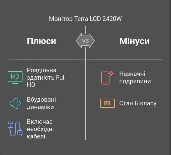 - Кабелі (VGA, 2x живлення, AUX) у комплекті