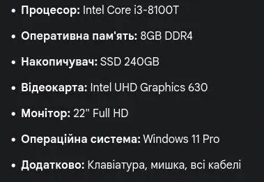 - Процесор: Intel Core i3-8100T (4 ядра по 3.1 GHz), 6 MB Smart Cache