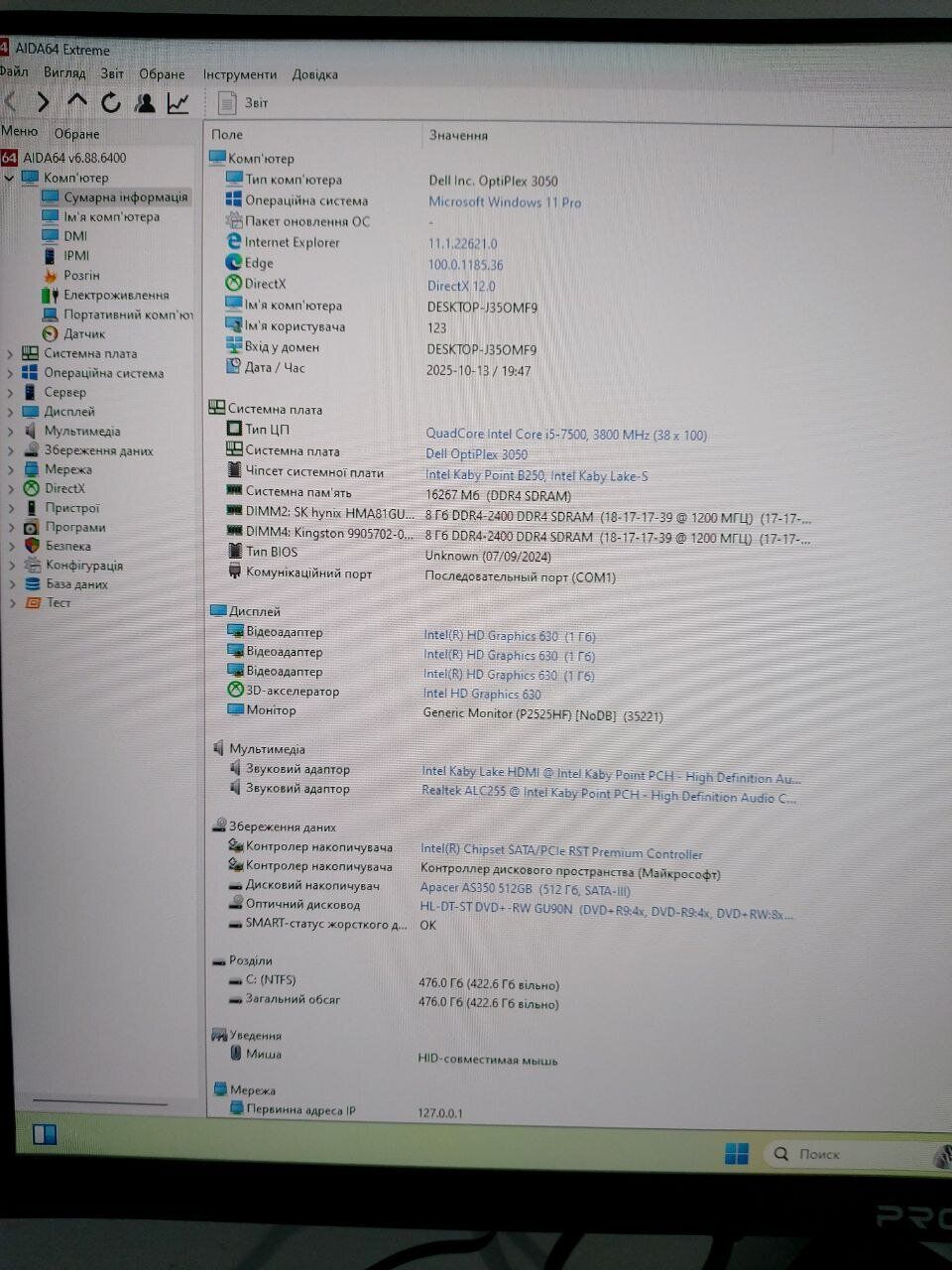 Комплект ПК: комп'ютер Dell OptiPlex 3050 SFF / Intel Core i5-7500 (4 ядра по 3,4 - 3,8 ГГц) / 16 ГБ DDR4 / 512 ГБ SSD / Intel HD Graphics 630 / DVD-ROM + Монітор Prologix P2525HF / 25" (1920x1080) IPS / VGA, HDMI б/в