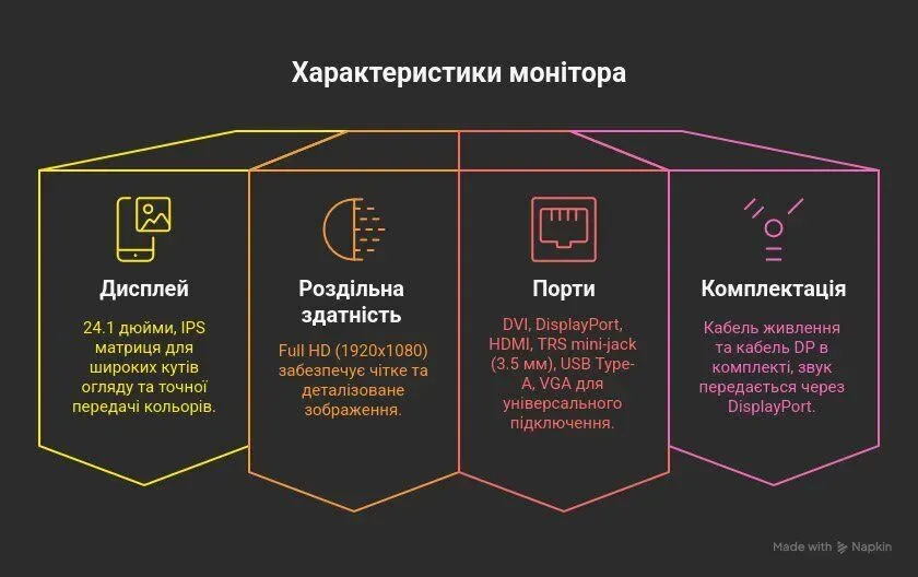 - Додатково: кабель живлення та кабель DisplayPort у комплекті (звук через DisplayPort)