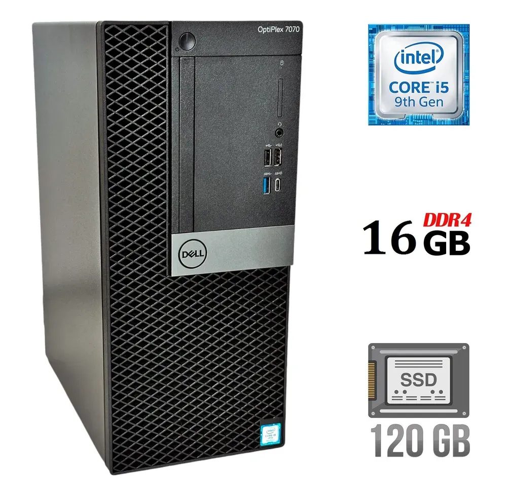 Комп'ютер Б-клас Dell OptiPlex 7070 Tower / Intel Core i5-9500 (6 ядер по 3.0 - 4.4 GHz) / 16 GB DDR4 / 120 GB SSD / Intel UHD Graphics 630 / 260W / DisplayPort б/в