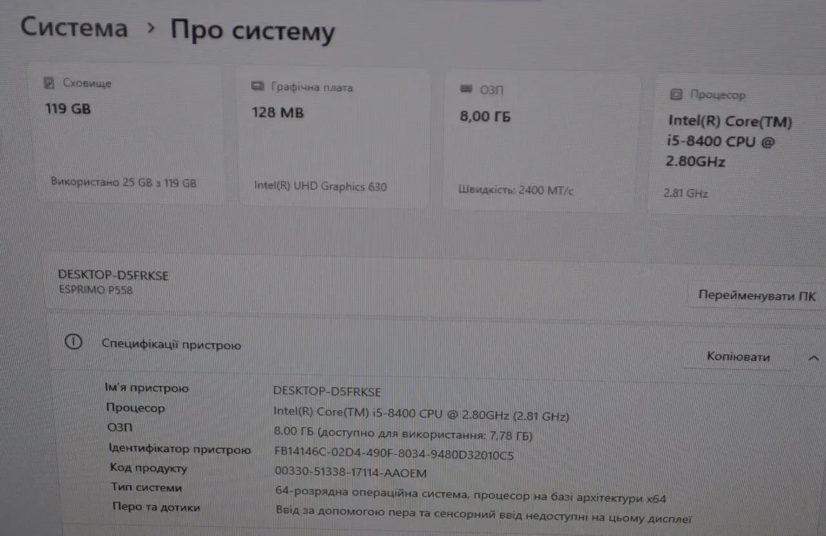 - Процесор: Intel Core i5-8400 (6 ядер з тактовою частотою 2,8–4,0 ГГц), 9 МБ Smart Cache