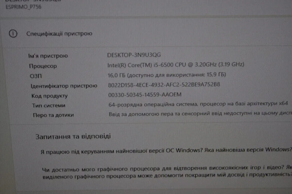 - Процесор: Intel Core i5-6500 (4 ядра з тактовою частотою 3,2–3,6 ГГц), 6 МБ Smart Cache