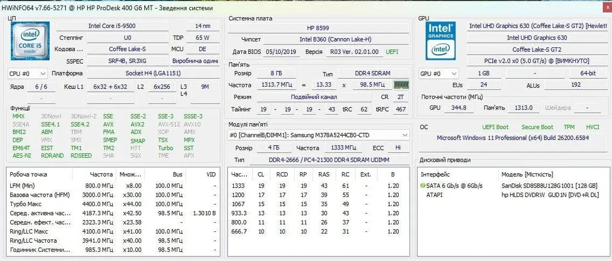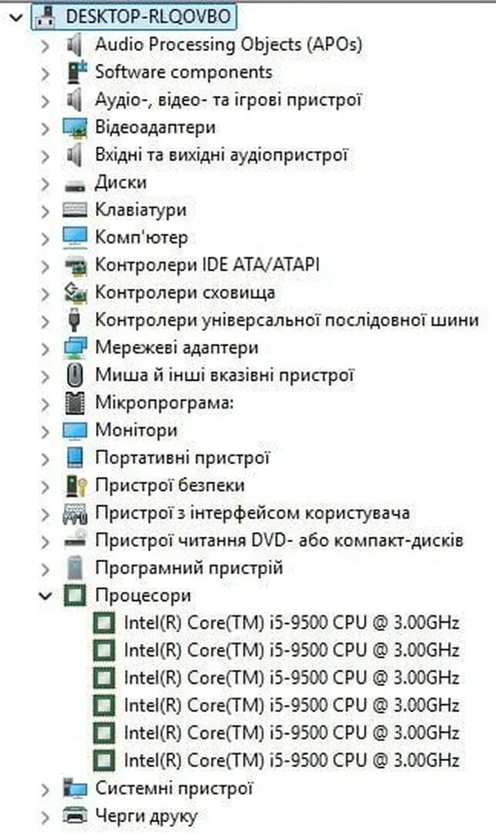 - Процесор: Intel Core i5-9500 (6 ядер з тактовою частотою 3,0–4,4 ГГц), 9 МБ Smart Cache