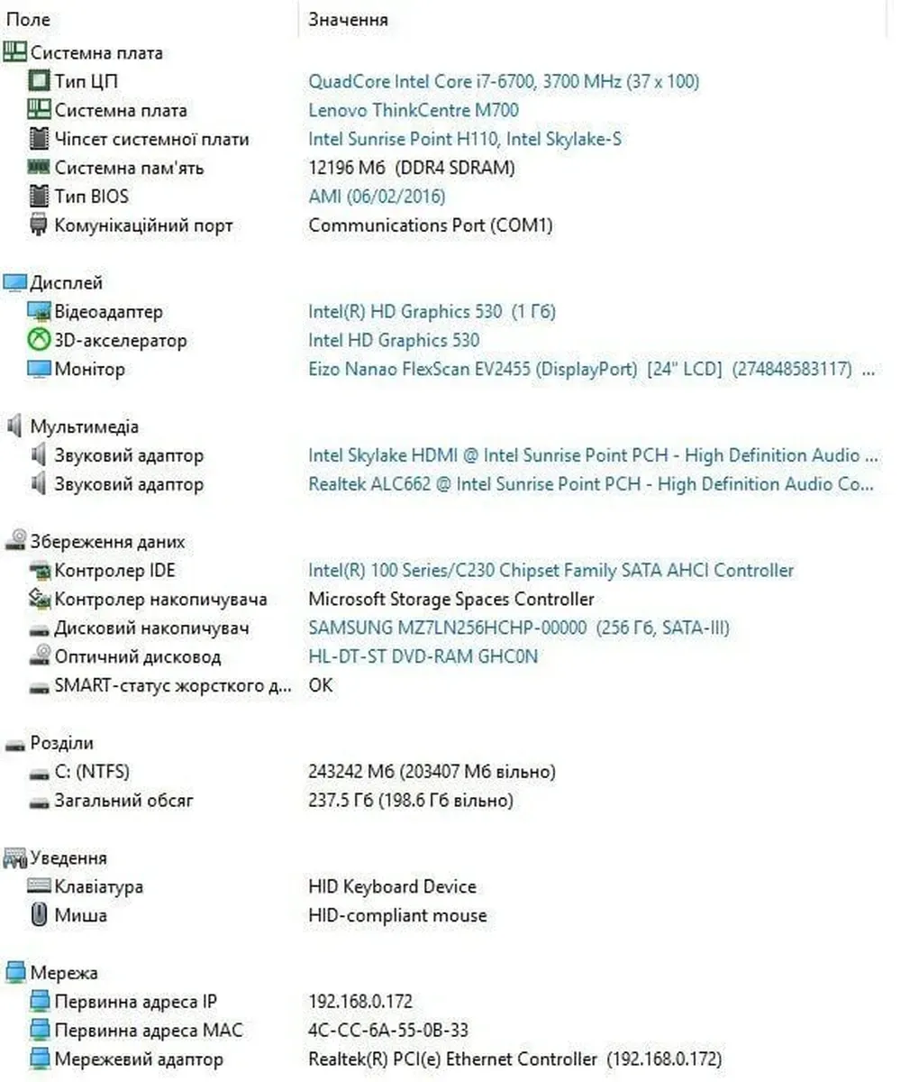Комп'ютер Lenovo ThinkCentre M700 Tower на базі процесора Intel Core i7-6700 і оперативною пам'яттю 12 GB DDR4 для офісної роботи та домашніх завдань