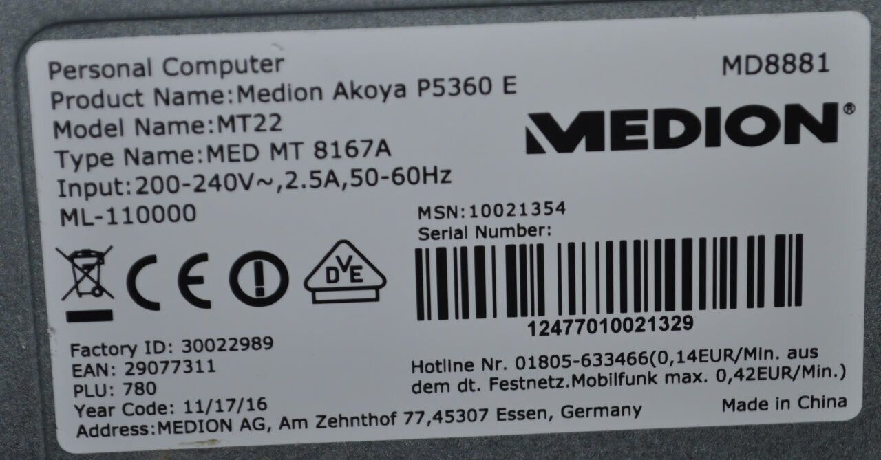 - Модель: Medion Akoya P5360 E-MT22 Tower