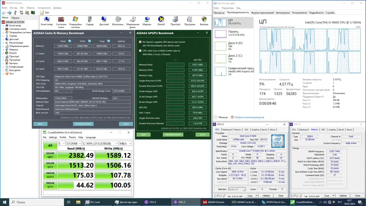 - Процесор: Intel Core i5-9600 (6 ядер по 3.1 - 4.6 GHz), 9 MB Smart Cache