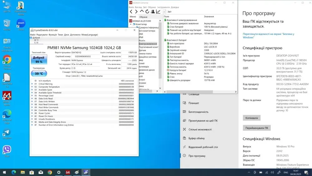- Процесор: Intel Core i7-9850H (6 (12) ядер по 2.6 - 4.6 GHz), 12 MB Smart Cache