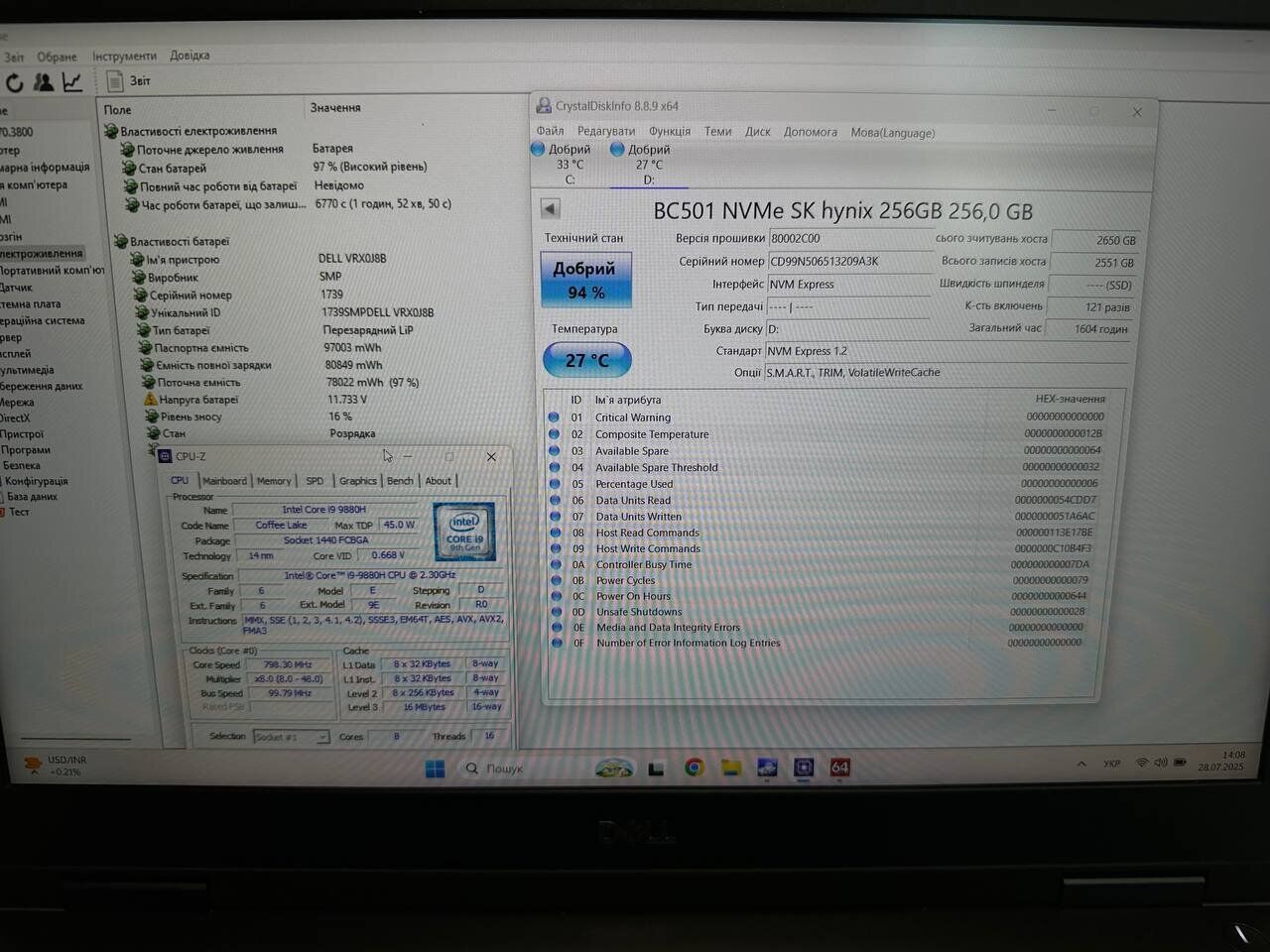 - Процесор: Intel Core i9-9880H (8 (16) ядер по 2.3 - 4.8 GHz), 16 MB Smart Cache
