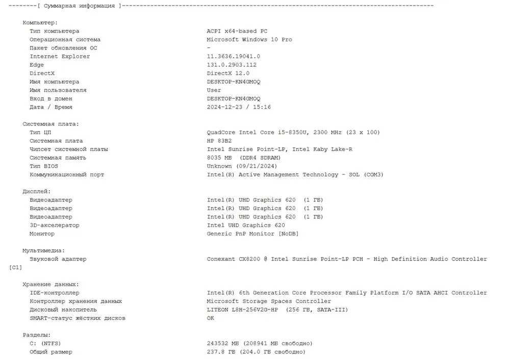 - Постійна пам'ять: 256 GB SSD (LITEON L8H-256V2G-HP)
