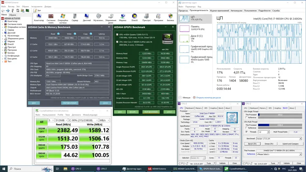 - Процесор: Intel Core i7-9850H (6 (12) ядер по 2.6 - 4.6 GHz), 12 MB Cache