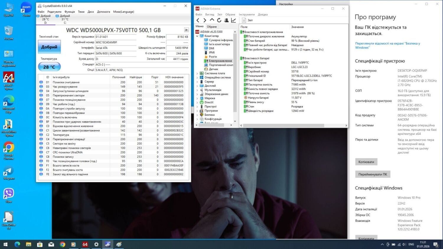 - Комплектація: ноутбук, зарядний пристрій, наклейки на клавіатуру