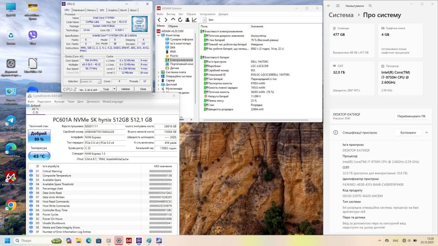 - Процесор: Intel Core i7-9750H (6 (12) ядер з тактовою частотою 2,6–4,5 ГГц), 12 МБ Smart Cache