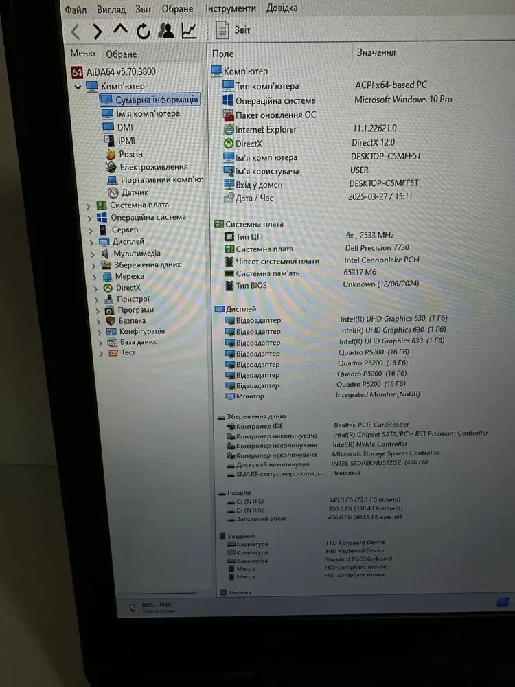 - Графіка: дискретна nVidia Quadro P5200, 16 GB GDDR5, 256-bit