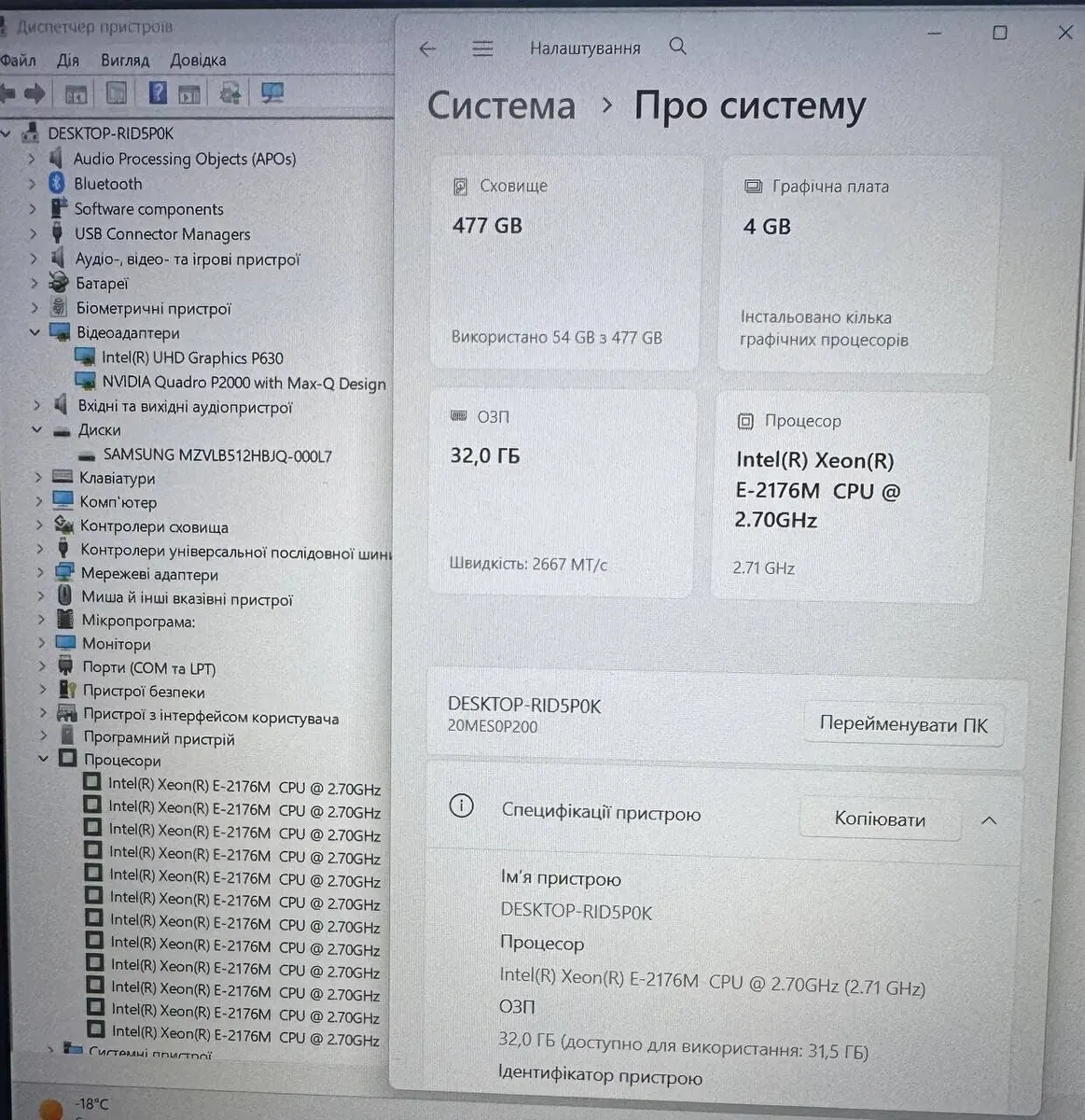 - Графіка: дискретна nVidia Quadro P2000, 4 ГБ GDDR5, 128-біт