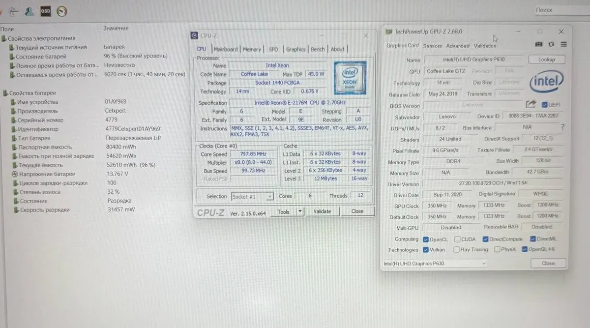 - Процесор: Intel Xeon E-2176M (6 (12) ядер по 2,7 - 4,4 ГГц), 12 МБ Smart Cache