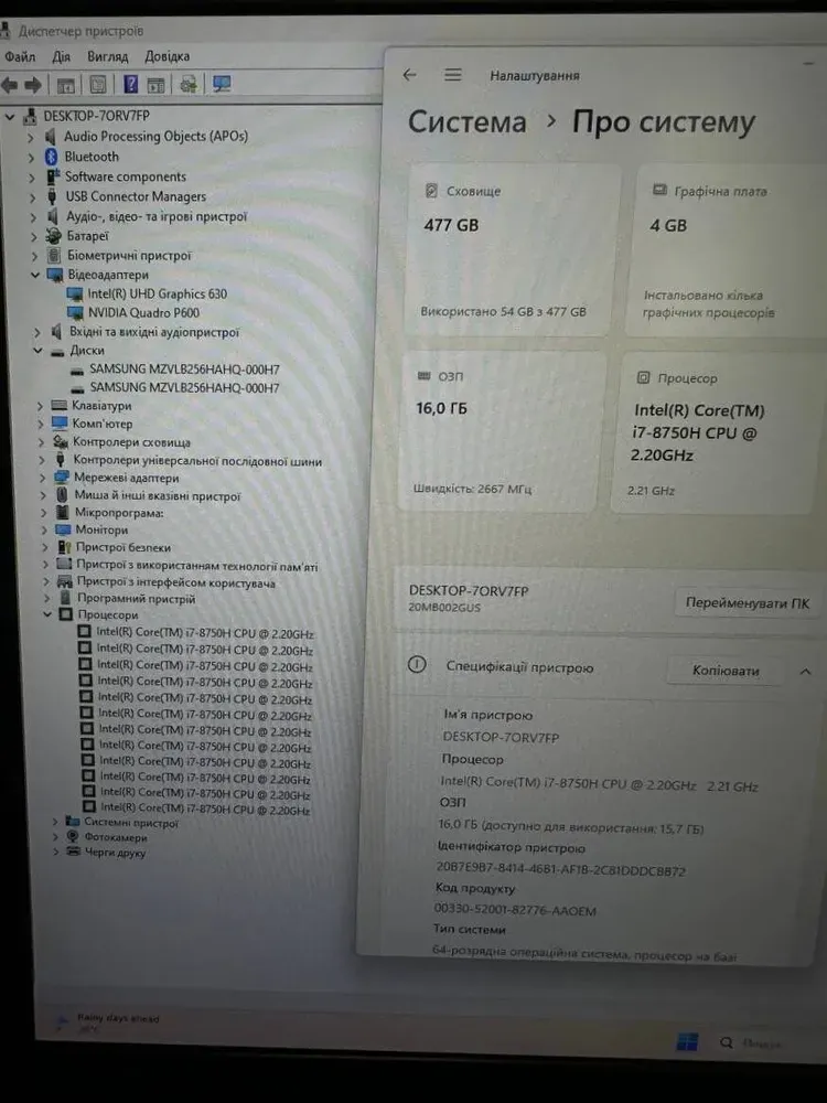 - Процесор: Intel Core i7-8750H (6 (12) ядер по 2.2 - 4.1 GHz), 9 MB Smart Cache