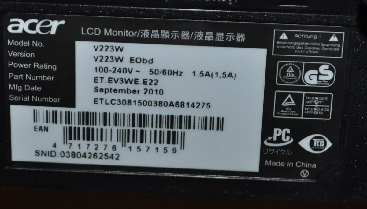 - Модель: Acer V223W