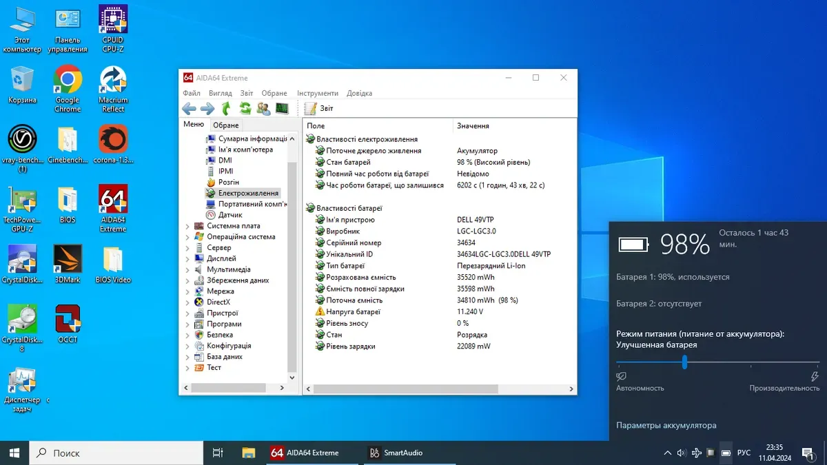 - Батарея: не менше 1.5-2 години в режимі звичайного навантаження, знос 0%